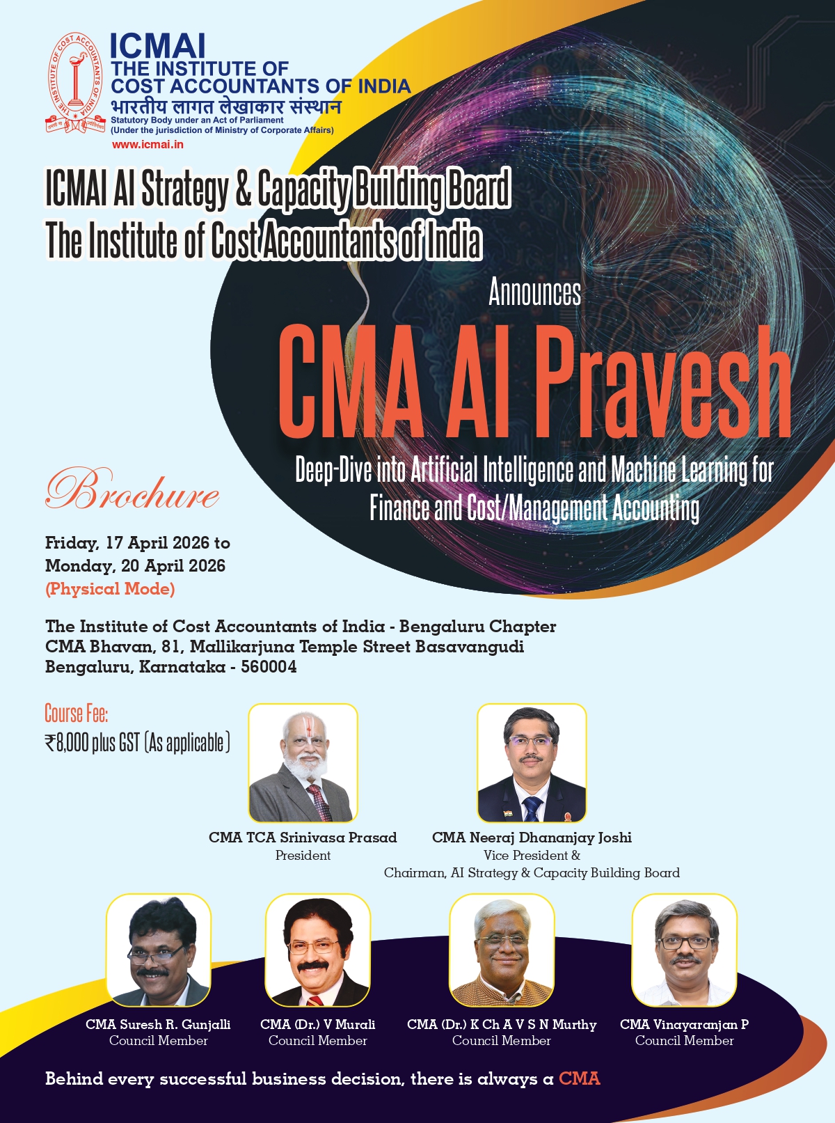 CMA TCA Srinivasa Prasad is a Fellow Member of ICMAI. He has experience of more than 40 years in the areas of Finance, Cost, Management, ERP, IT, HR, IED, O&M, MM, CSR.
